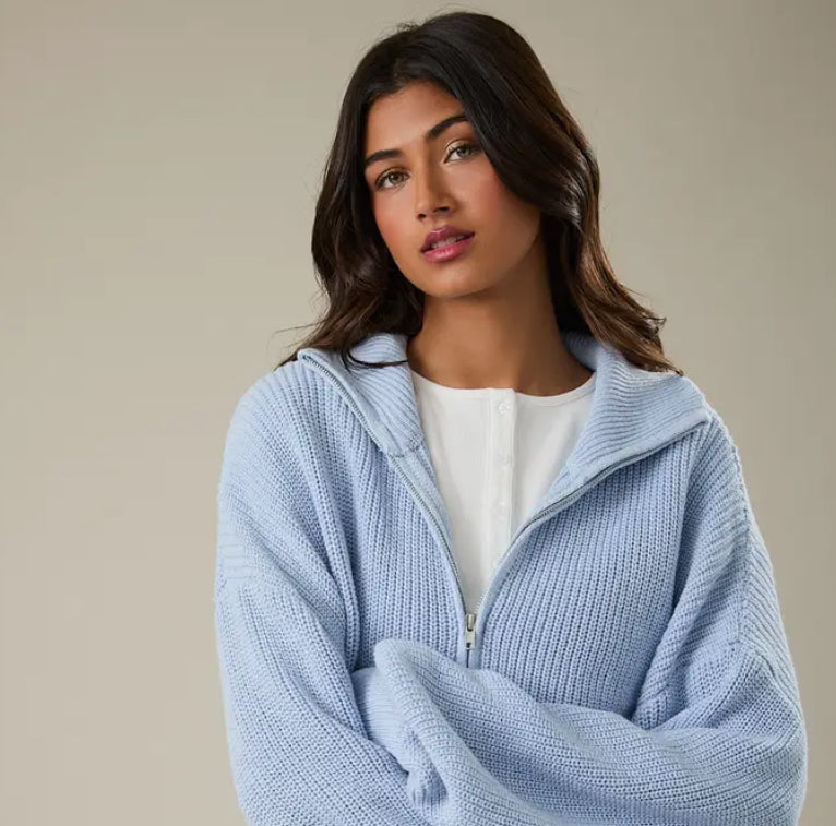 Expertly designed to keep you cozy and stylish, our Zip Up Oversized Sweater Cardigan in Baby Blue is a must-have addition to your wardrobe. Crafted with a beautiful color and ultra-comfortable fabric, this cardigan is perfect for any occasion. Experience the perfect blend of fashion and comfort today.