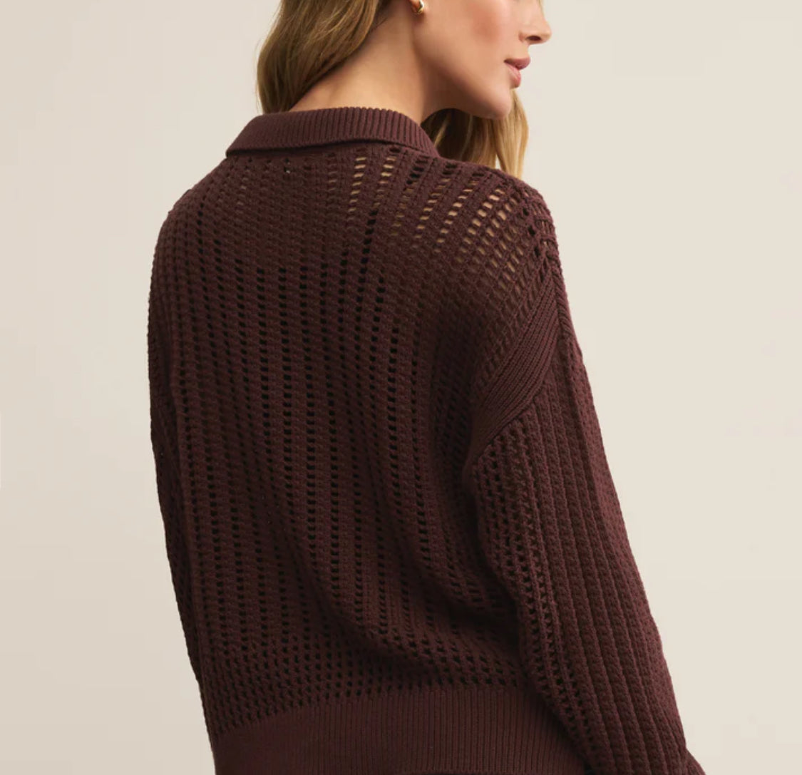 The Looking Glass Polo Sweater combines engineered open-stitch detailing and tortoise buttons for an elevated twist. Made with soft Sienna yarns, this midweight sweater adds texture to any outfit. Hand wash or dry clean for best results.