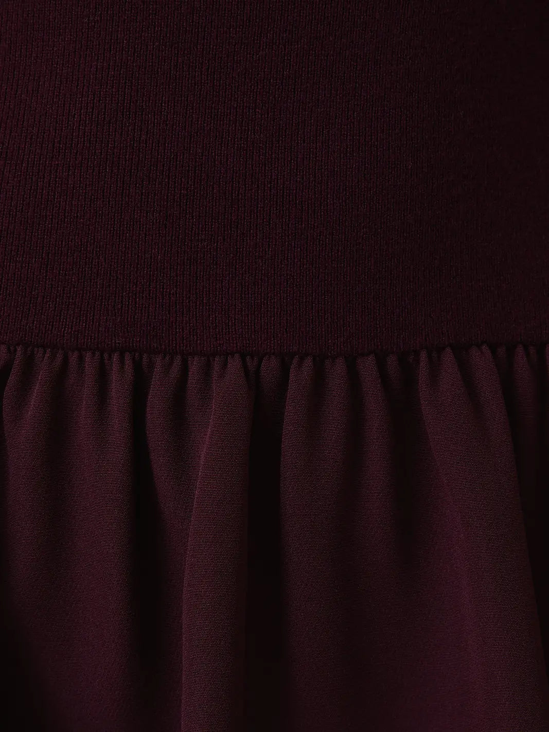 This beautiful midi dress features a stunning maroon color that adds a touch of elegance to any outfit. Made with a blend of woven and knit materials, it offers a perfect mix of comfort and style. Elevate your wardrobe with this versatile piece, perfect for any occasion.