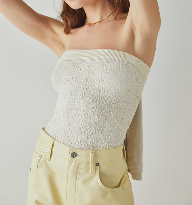 Your favorite textured cami from our Love Letter collection is now featured in a strapless, straight-neck silhouette and formfitting design.