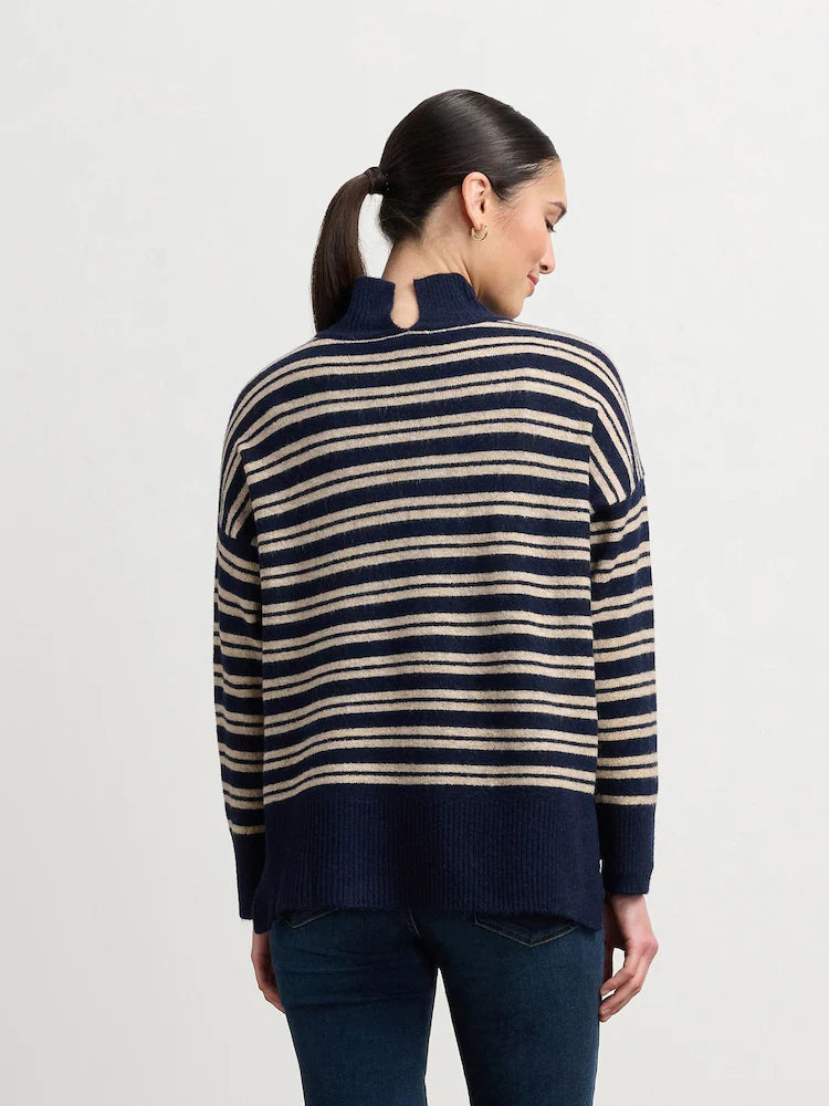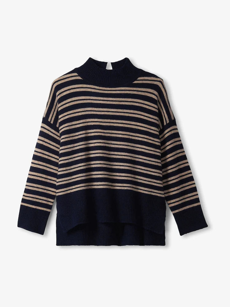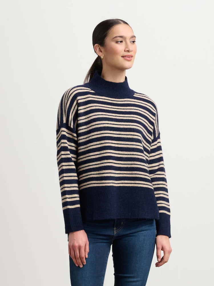 Elevate your fall wardrobe with our Mock Neck Sweater in Timeless Autumn Stripes. The boxy silhouette and high-low hem provide a comfortable and stylish fit, while the back neck opening adds a touch of chic. A must-have for any season and made to last, it's a Hatley classic that will never go out of style.