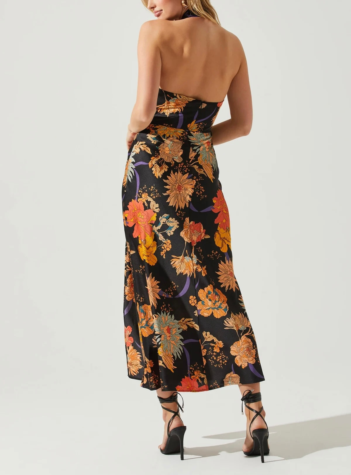 Be the most stylish one in the room with Marissa Dress Black Orange Floral. Boasting a shimmery satin construction with a bold floral print, the dress features a halter neckline and an open back design. It also comes with side seam slits and a hidden zipper closure for an elegant fit. Perfect for special occasions and weddings, be sure to pair with chic jewelry, a sleek clutch and high heels. Dry clean recommended.
