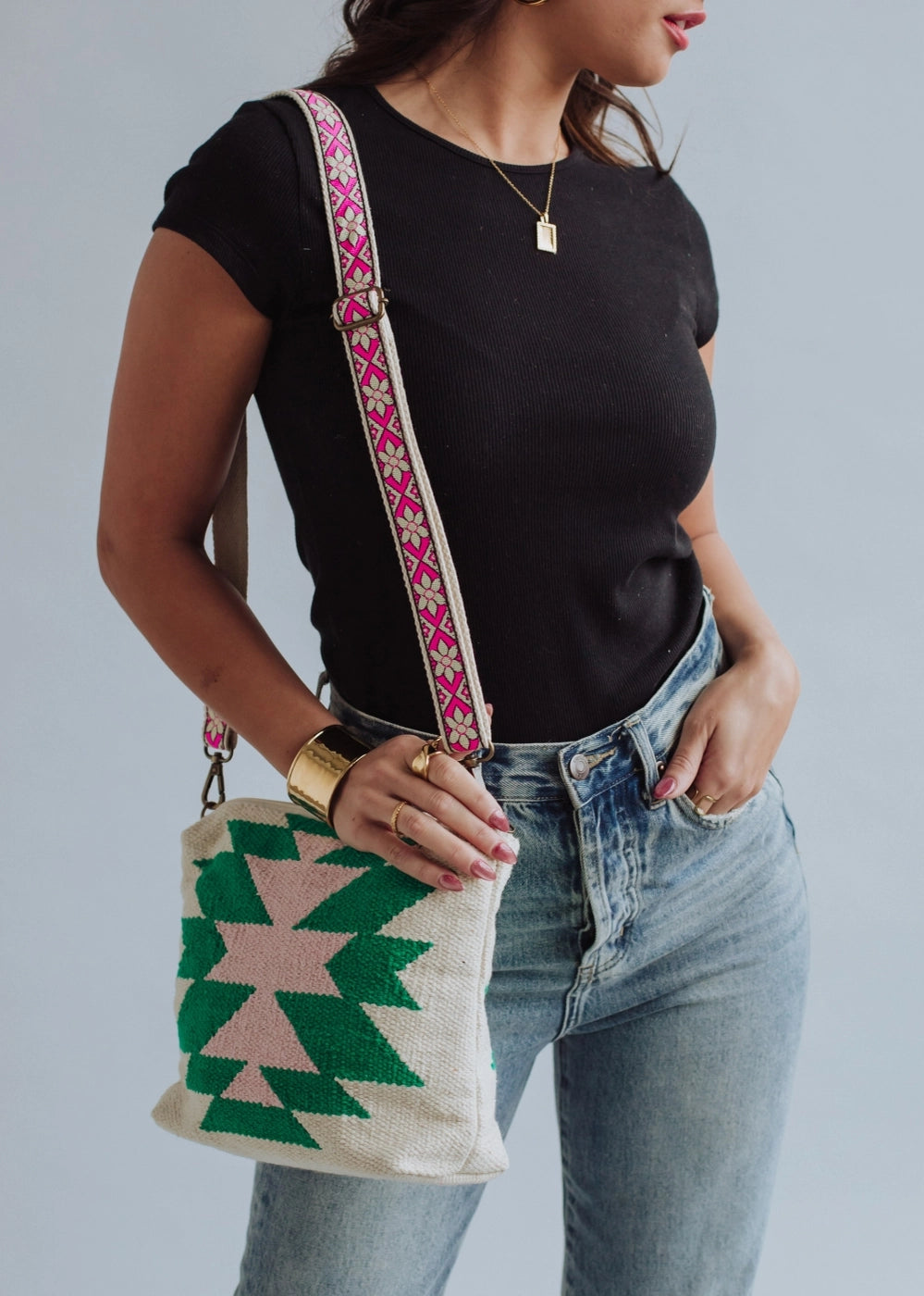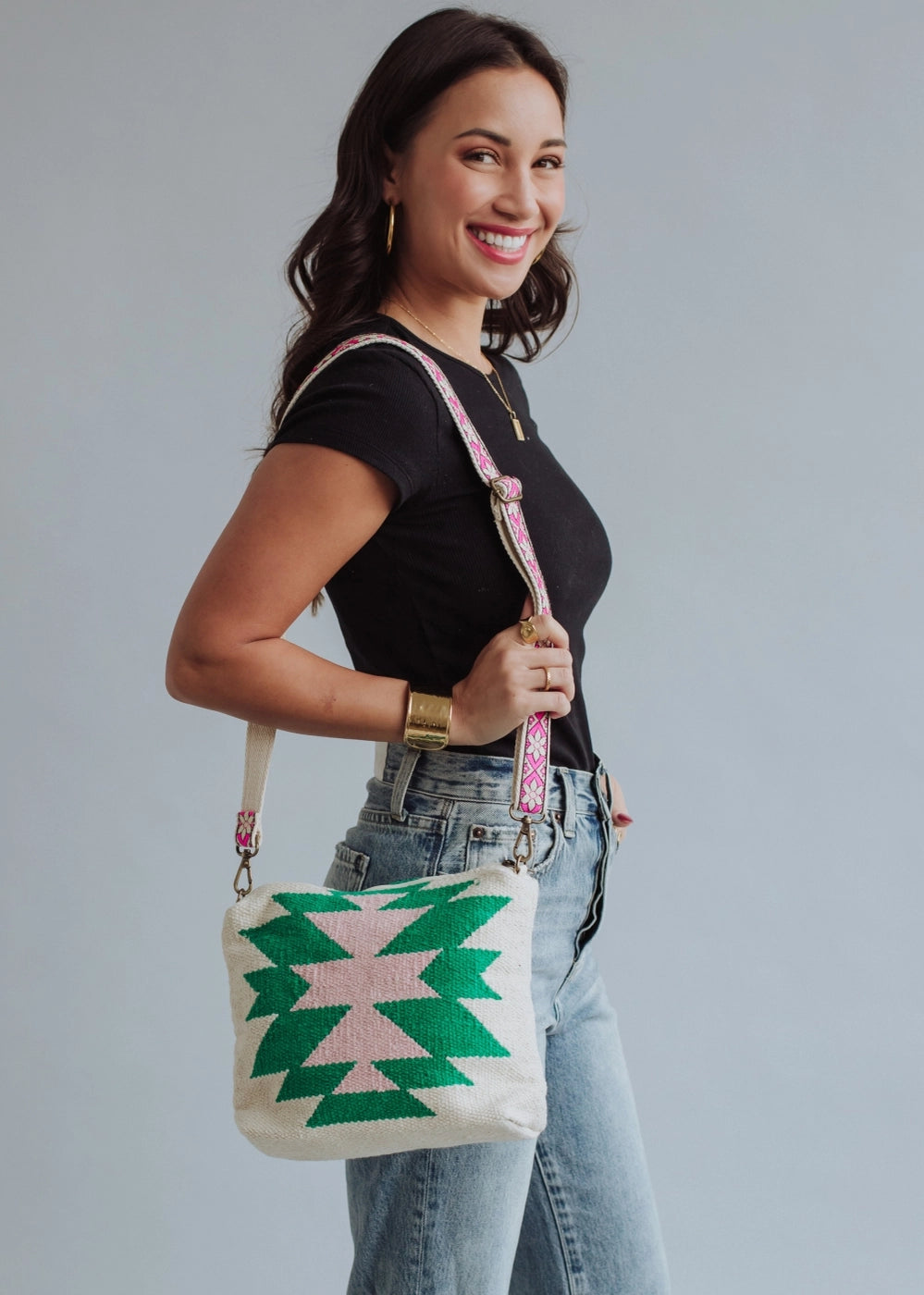 Beige, Green & Pink Aztec Crossbody