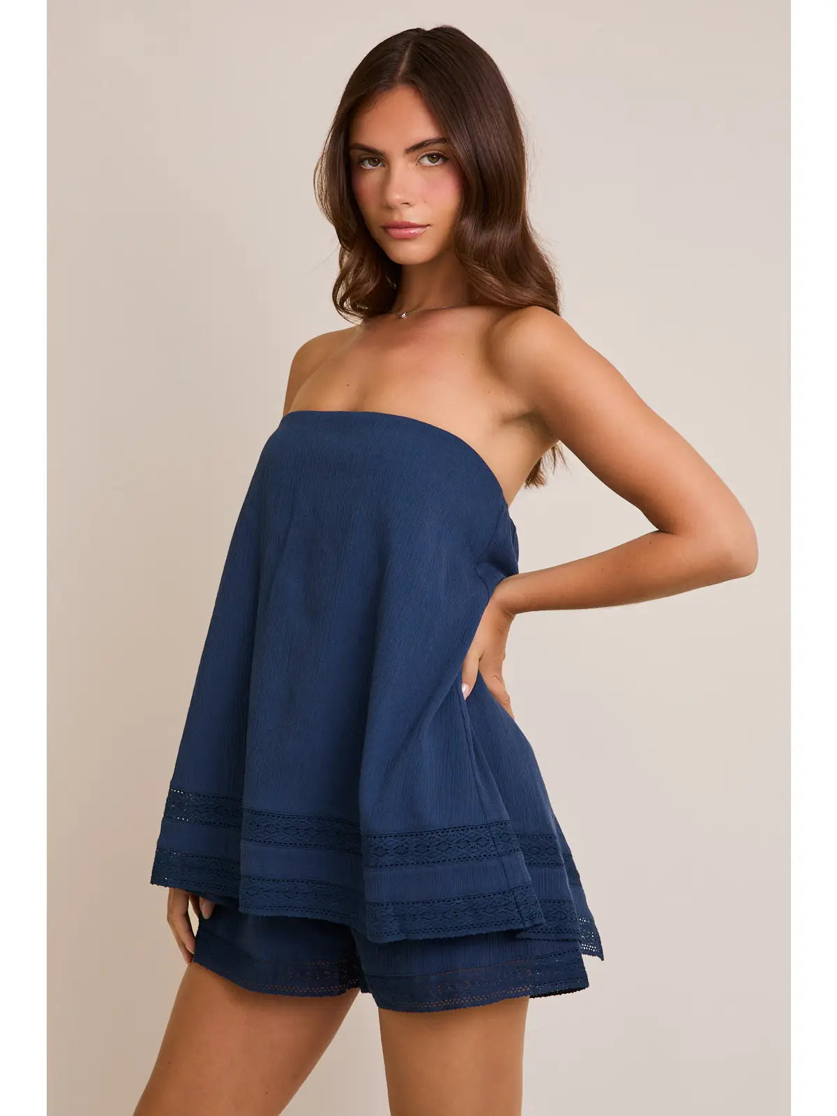 This lace trim detail tube romper combines trendy and cute styles into one timeless piece. The lace trim adds a touch of femininity, while the tube style enhances your natural shape. Perfect for any occasion, this romper is a must-have addition to your wardrobe.