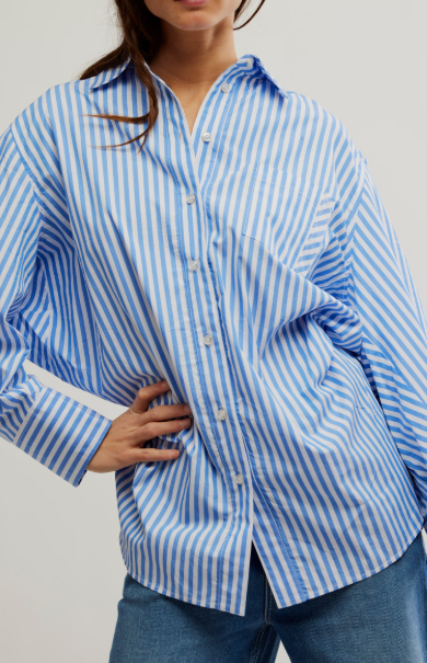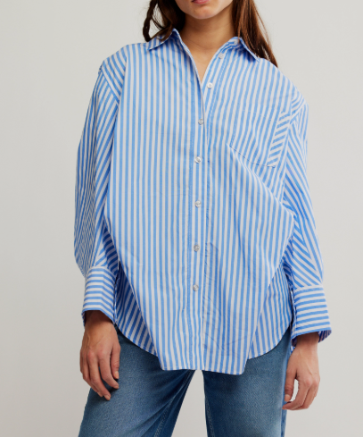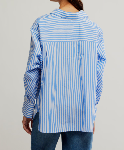 The Sabine Tailored Stripe Shirt in Oxford Blue Stripe offers a relaxed fit cinched at the waist for a flattering silhouette. Crafted from crisp cotton poplin, it features front darting to accentuate your waist, a classic collared neckline, and a button-front closure. Details like a patch pocket, drop-shoulder dolman sleeves with button cuffs, and back pleats create a unique, billowy shape that stands out from typical button-downs. The striped print adds timeless style, making this shirt a versatile and intentional addition to your wardrobe.