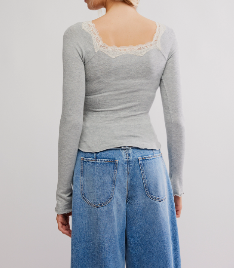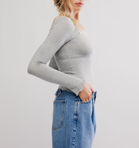 This Oh My Darling Long Sleeve in Heather Grey Combo offers a slim fit crafted from a soft cotton blend for lightweight comfort. Featuring a wide boat neckline, delicate lace piecing at the neck, and lettuce-edged trimming, this top adds subtle dimension and elegance to your everyday wardrobe. Perfect for layering or wearing on its own, it combines style and softness effortlessly.