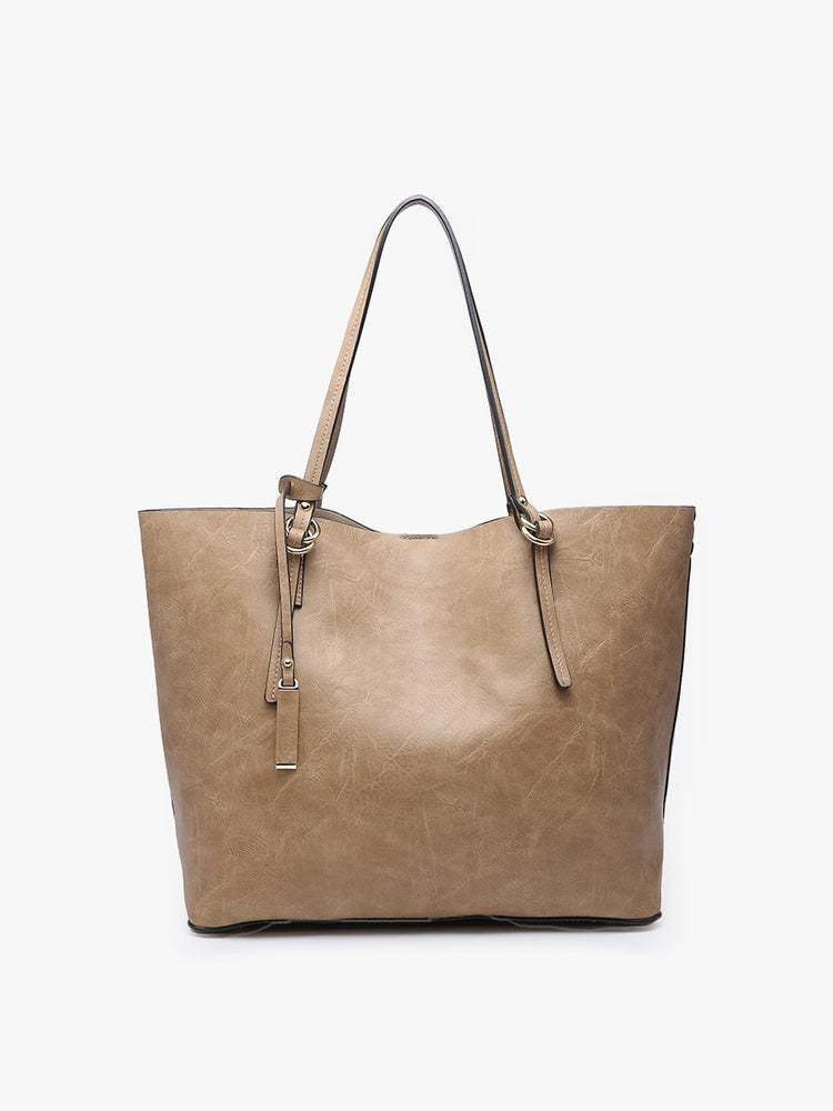 2 in 1 handbag Inner bag included with 1 zipper pocket and 2 accessory pockets Inner bag has herringbone lining Removable adjustable shoulder strap Magnetic snap closure Gold tone hardware Vegan leather Dimensions: 15" L x 6.5" D x 12.5" H