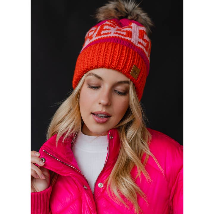 Stay stylish and warm on the slopes with our Orange & Pink Apres Ski Pom Hat! Made with a cozy fleece lining and 100% acrylic material, this hat features a trendy mix of orange, light pink, and pink. Complete your winter look with the natural faux fur pom and stand out on the mountain.