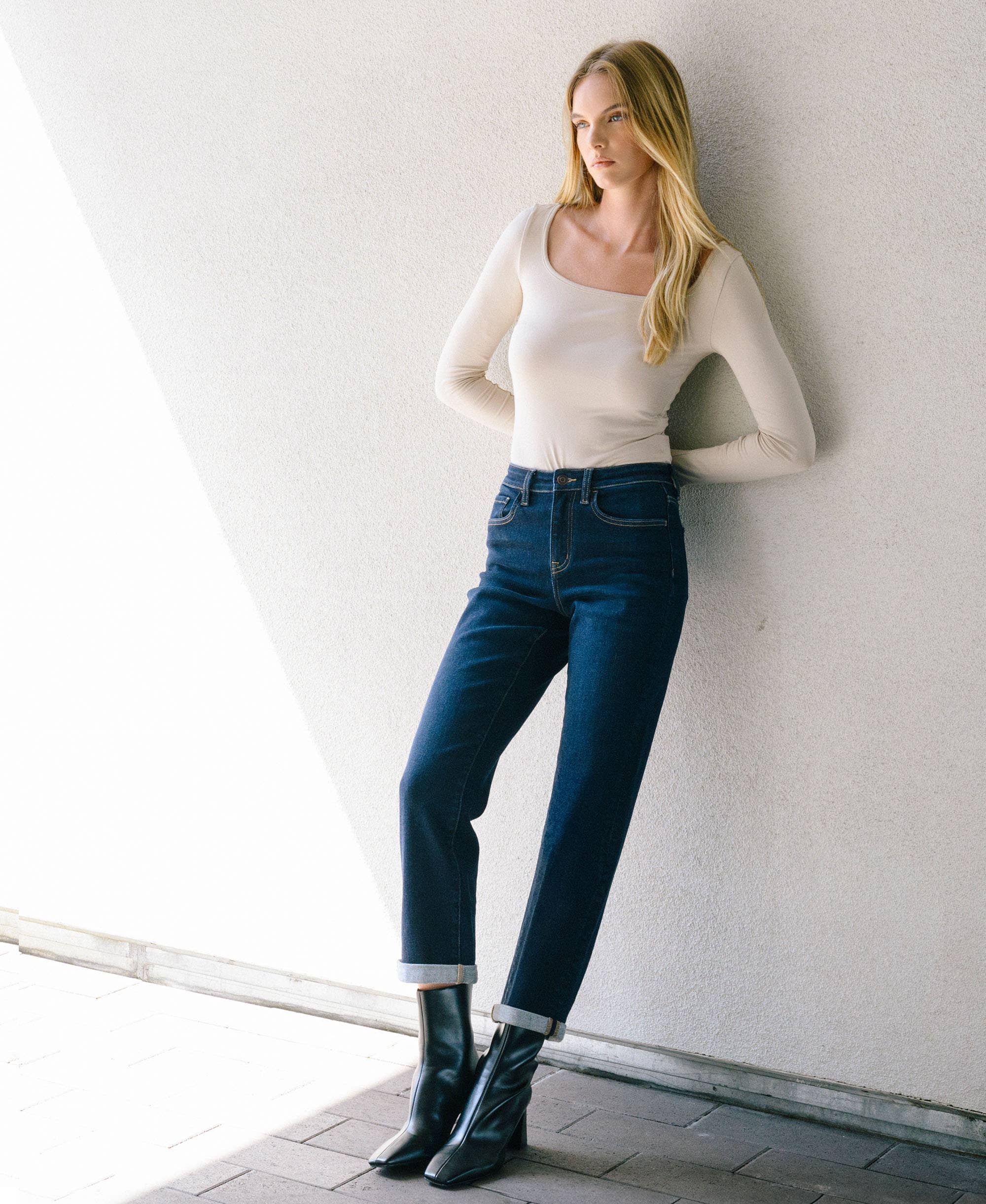 HIGH RISE CUFFED CROP STRAIGHT JEANS COMFORT STRETCH DENIM, HIGH RISE WAIST, DOUBLE CUFF HEM, CROPPED LENGTH, STRAIGHT JEANS F. RISE: 11" / INSEAM: 27" / LEG OPENING: 15 1/2" / CUFF: 1 1/4" X 2 MODEL IS 5'10" WEARING SIZE 26