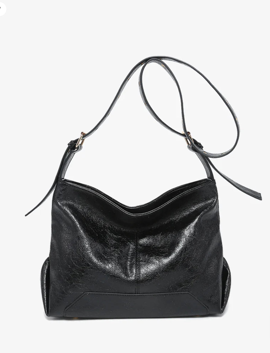 Elevate your style with the Taylor Vegan Semi-Gloss Hobo. Crafted from glossy vegan leather, this sleek bag boasts a top zip closure and metal feet for durability. The adjustable crossbody strap with grommet detailing adds an edgy touch. With its spacious dimensions (13"L x 9"H x 4"D), this bag is perfect for your everyday needs.