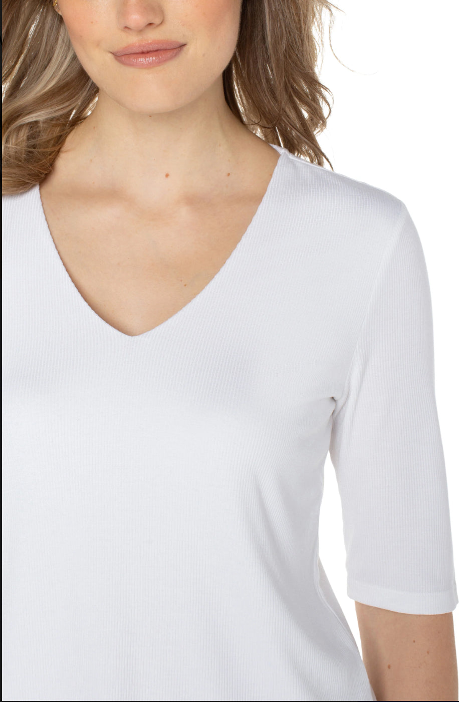 This Double Layer V-neck Rib Knit Top in cream is a must-have in any wardrobe. Crafted from a soft, mini rib knit, it offers a sleek and flattering fit. With a front double layer for confident coverage and an elbow-grazing sleeve for a touch of sophistication, it effortlessly transitions from day to night.