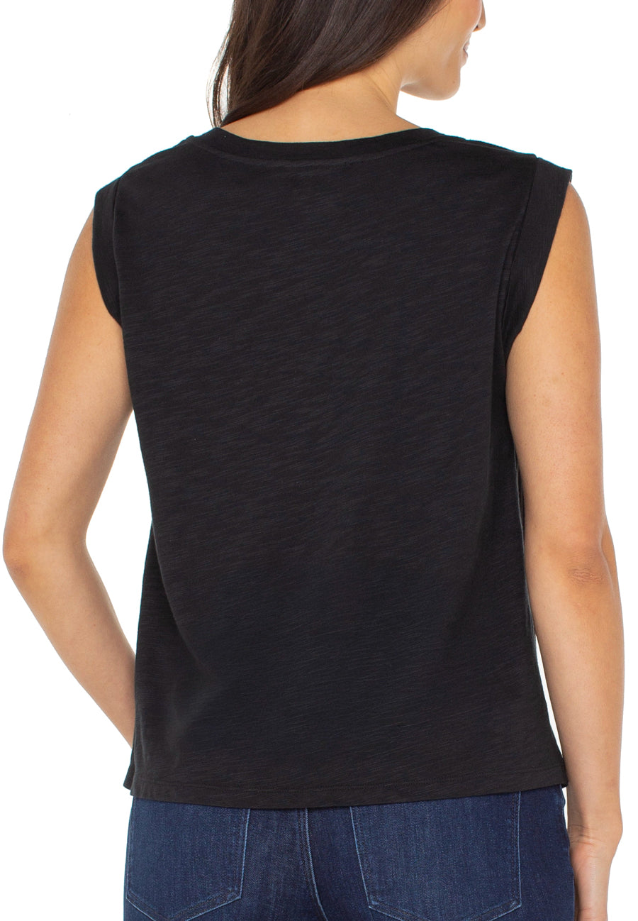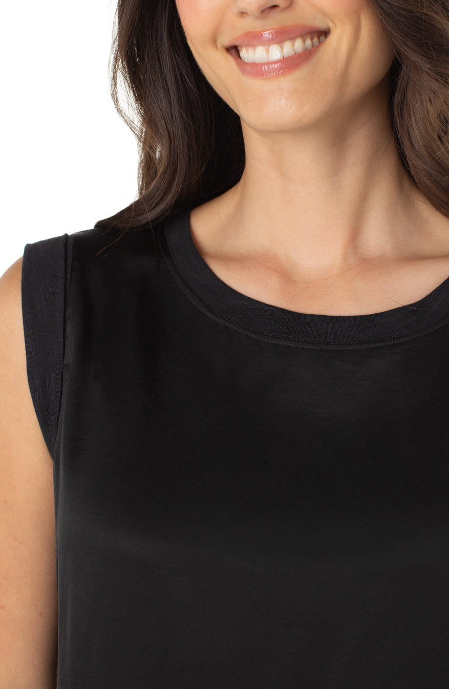 This versatile top combines a polished woven front with a soft knit back for both structure and comfort. Effortlessly transition from day to night with this sophisticated and comfortable sleeveless top, perfect for any occasion.
