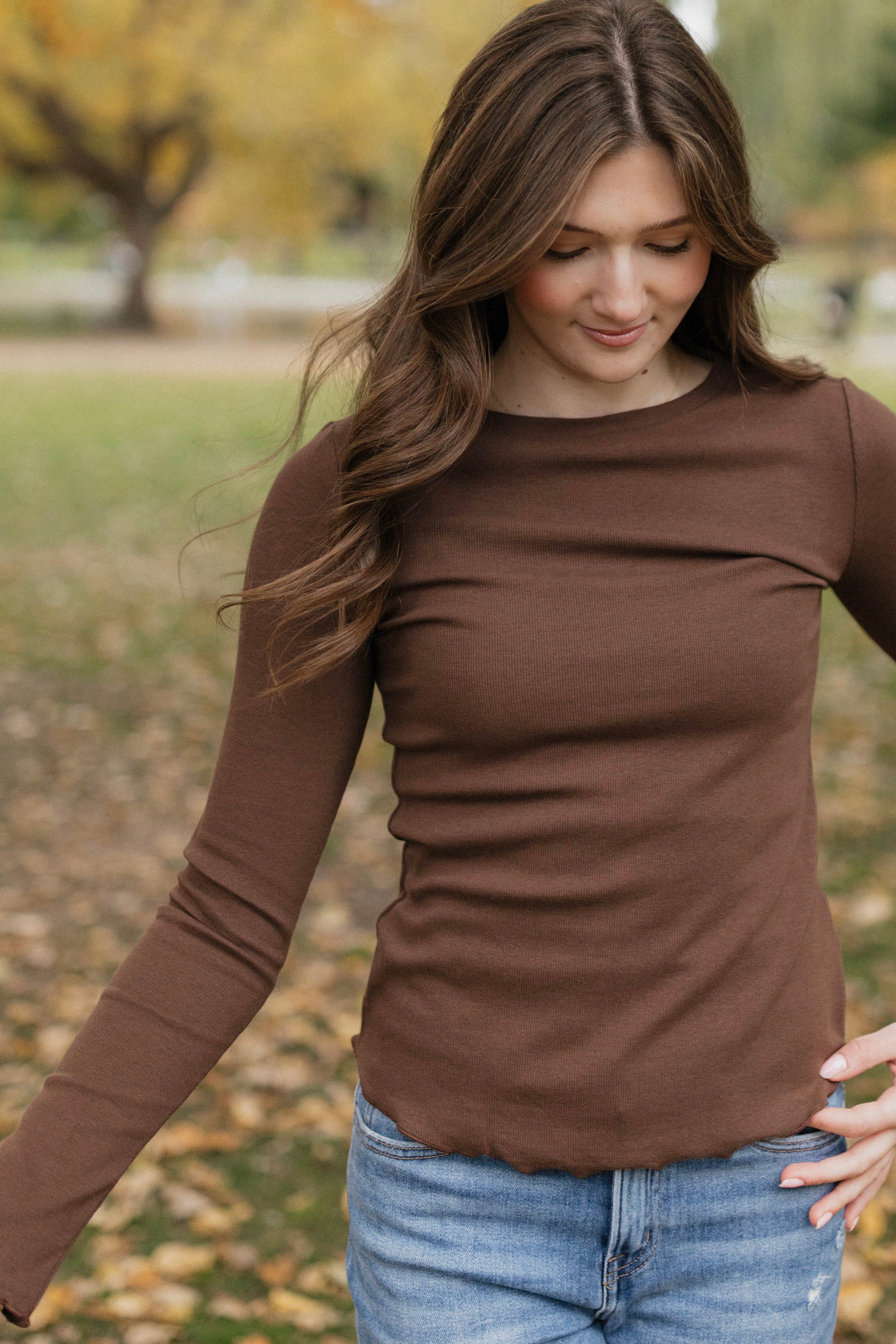 This espresso ribbed long sleeve is made with our softest fabric, featuring lettuce stitch edges and medium length for a comfortable and stylish look. Enjoy the benefits of both warmth and style with this versatile piece, perfect for any occasion.
