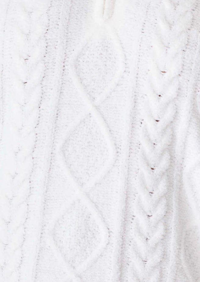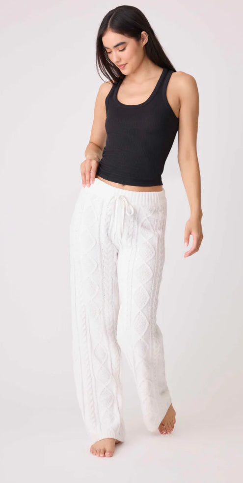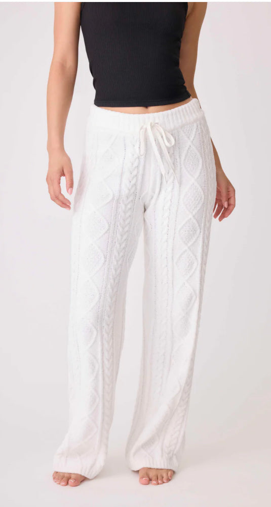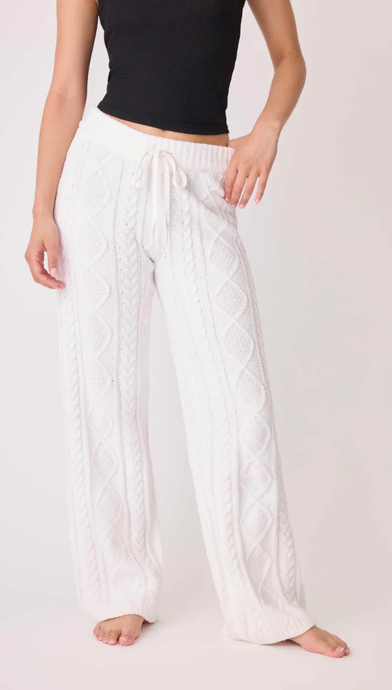 Indulge in ultimate comfort with our Chenille Cable Knit Crew Lounge Pants in ivory. Made with a velvety soft chenille knit and classic cable pattern, these pants are perfect for lounging on lazy days. The easy drawstring waist and open-leg silhouette make them versatile and perfect for pairing with your favorite sweater.