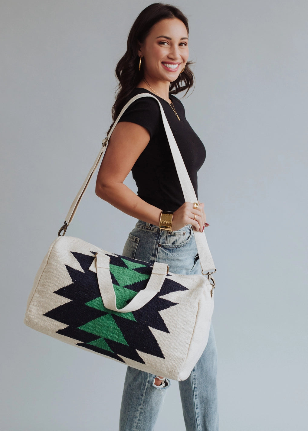 This duffel offers a stylish Aztec design in cream, navy, and green colors. Its zipper closure and interior pockets provide secure storage, while the 100% cotton material ensures durability. Measuring 19" x 9" x 11", it offers ample space for your belongings.