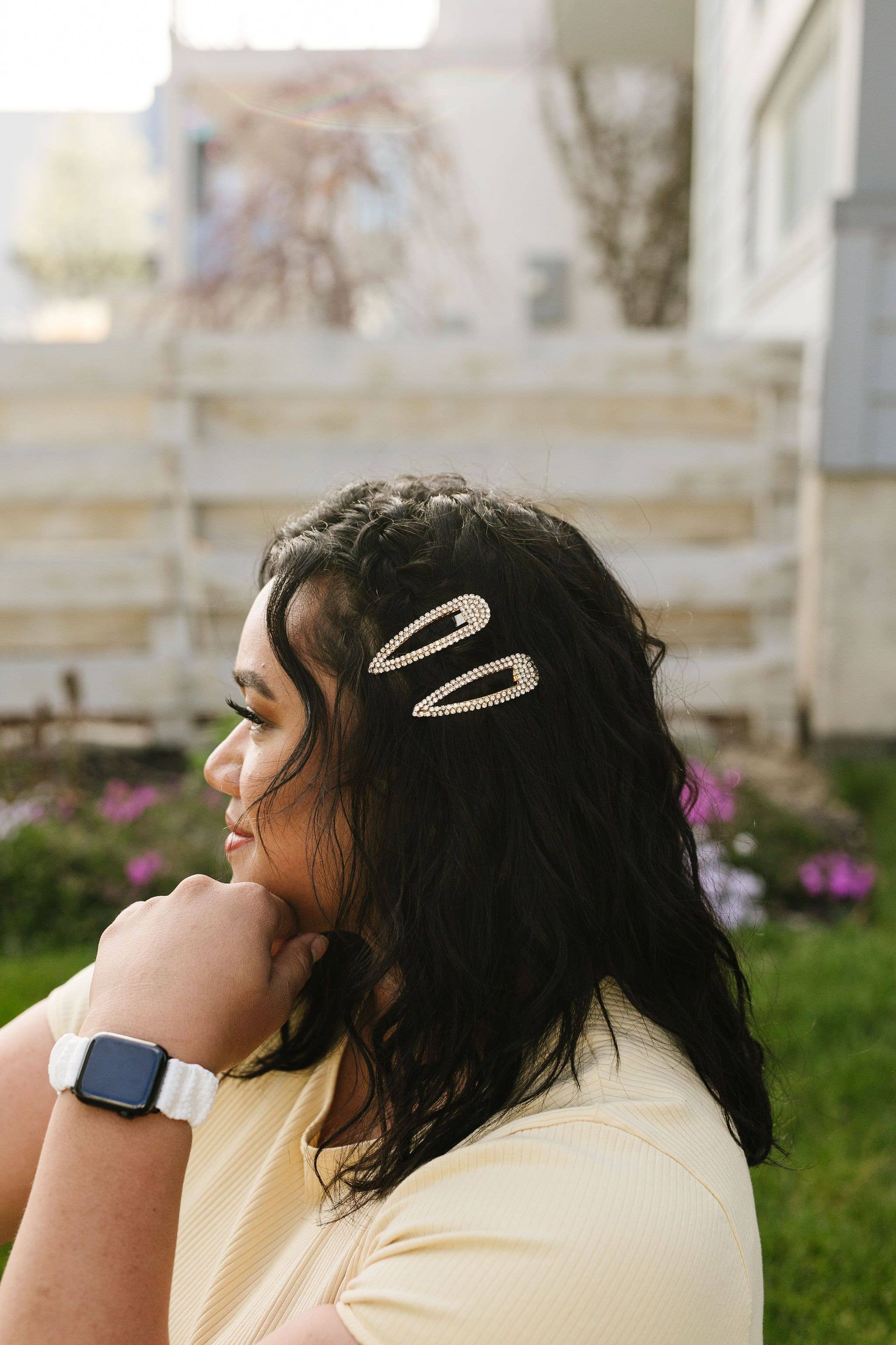 This clip duo is one of my most favorite! I've already worn them a couple times and get so many compliments! They are snap clips studded in crystal rhinestones! I am seriously so in love with them and they will match anything! These clips are ideal for pinning your bangs back!