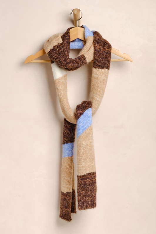 Our Carina Swirl Scarf in tan is the ultimate finishing touch for any outfit. This versatile scarf adds a vintage-inspired vibe with its thin knit style and timeless color-blocked striping. Perfect for any occasion, it is a must-have staple in your wardrobe.