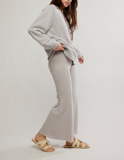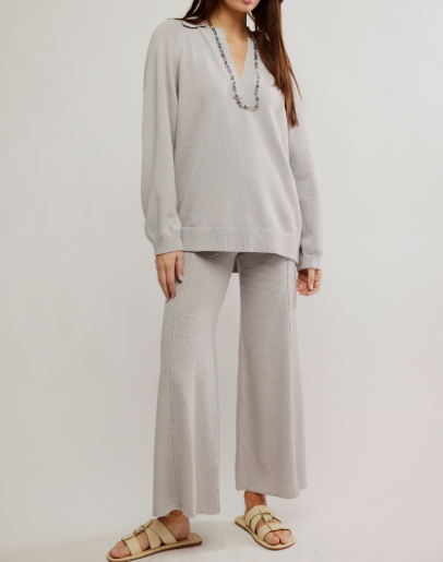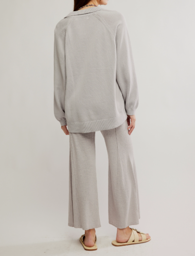 The Drea Sweater Set in Quiet Grey offers an effortlessly chic look with an oversized, relaxed top featuring a notched collar neckline and banded sleeves crafted from cozy knit fabric. The mid-rise pants provide a relaxed flare fit with a convenient pull-on design and raised seaming for added dimension, made from coordinating fabric. Perfect for pairing with beachy sandals or casual sneakers, this versatile set adapts seamlessly from laid-back days to off-duty outings.