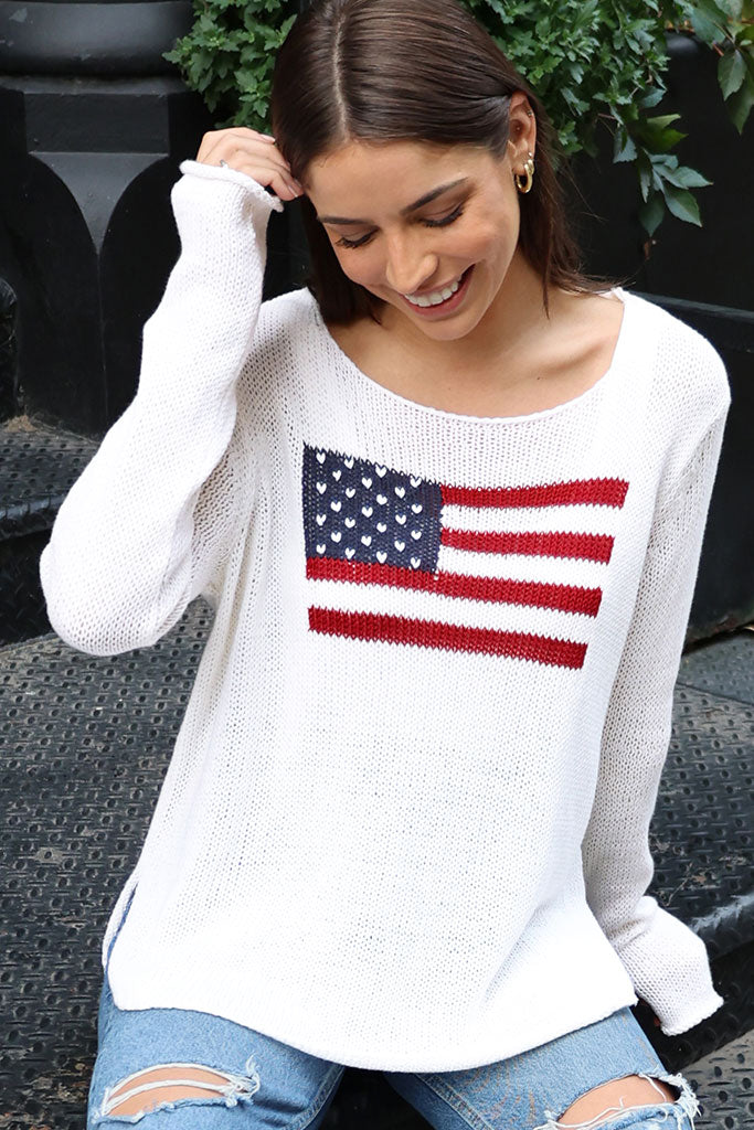 Introducing our Flag Crew Cotton Knit Sweater in White. Made with soft and breathable cotton blend yarn, this crew neck provides a flattering, relaxed fit. The American flag graphic on the front adds a patriotic touch. With a rounded hem and side slits, this versatile top can be worn tucked, knotted, belted, or as is. True to size.