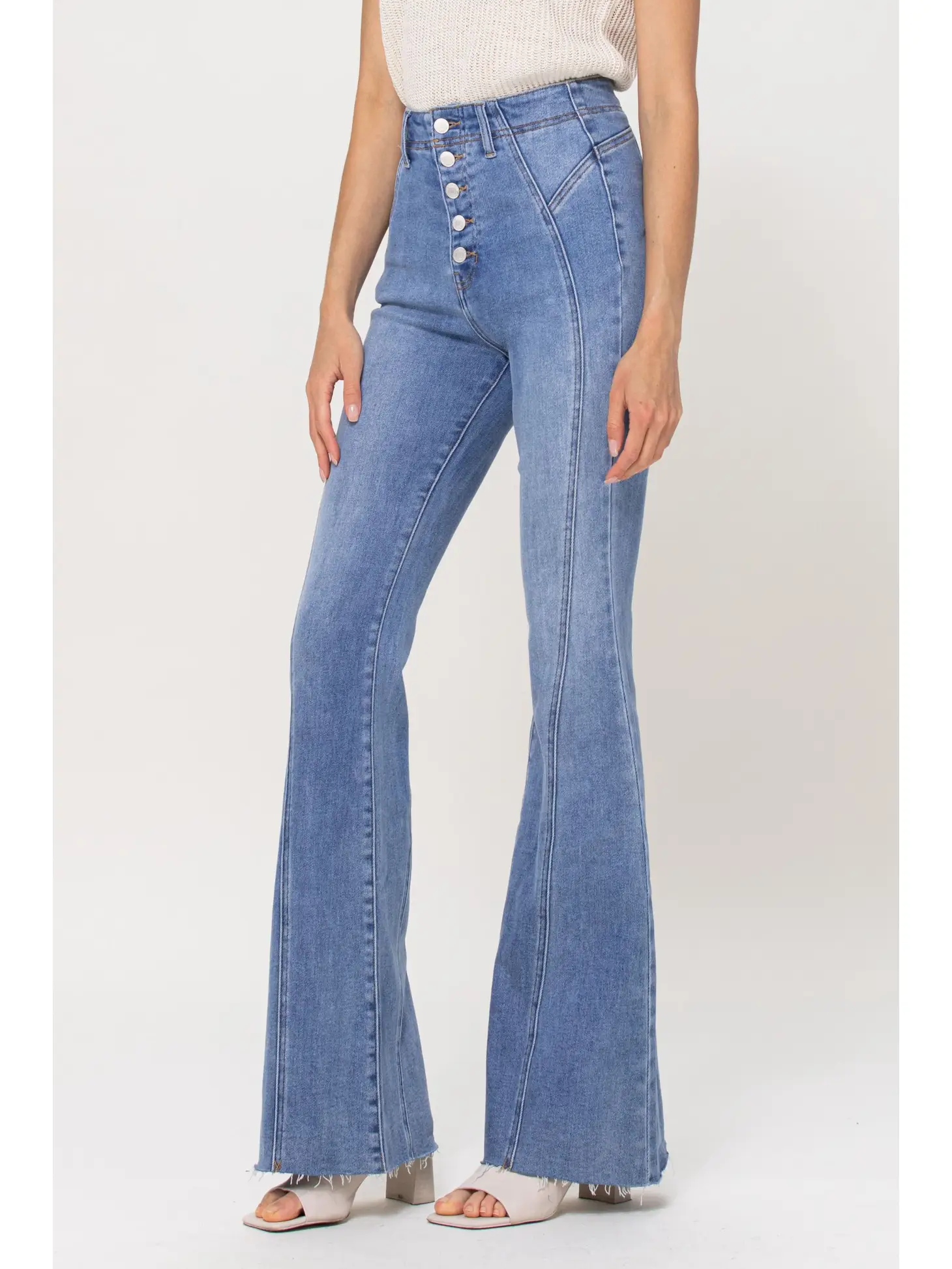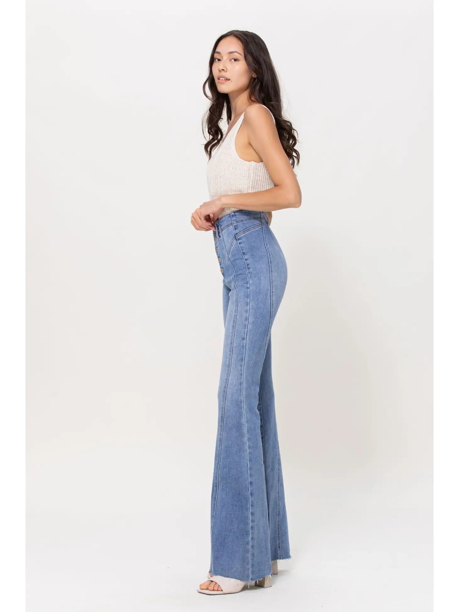 Upgrade your denim collection with our Hi Rise Flare with Seam Details. Crafted with premium fabric and intricate seam details, these 70's inspired flares hug your hips and accentuate your curves. The high waist and full length add to the flattering fit. Available in medium denim, these jeans are a must-have for any fashion-forward wardrobe.