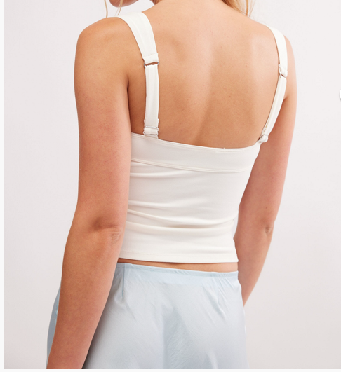 Introducing our Iconic Cami. This form-fitting, semi-cropped top features a stretchy fabrication for ultimate comfort. The extra wide neckline and criss-cross bust add a touch of style, while the seamed detailing and thick adjustable straps provide the perfect fit. Elevate your wardrobe with this must-have piece.