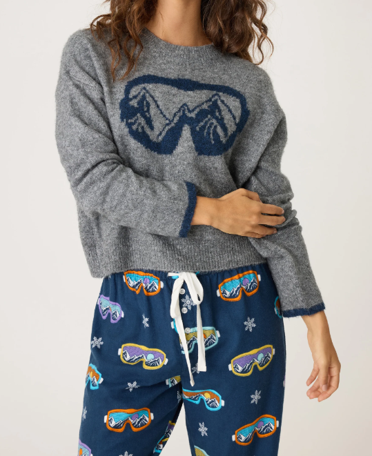 Say "adios" to chilly days with the cozy Ski You Later Snuggle Sweater. With its soft grey fabric and relaxed fit, this long sleeve top will keep you snug and stylish. Featuring a fun ski-goggle graphic and navy tipping on sleeve cuffs, it's perfect for bundling up après-ski or anytime.