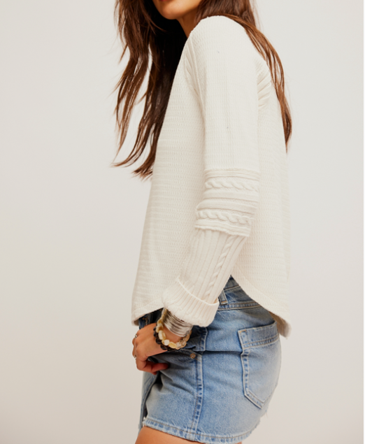 Elevate your everyday look with our Swinging Cable Cuff Ivory Combo. The waffle knit and cable details add texture and interest, while the arm details and raw hem give it an effortless, relaxed vibe. Finished with rolled sleeves, this top is the perfect combination of comfort and style.