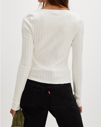 The Tilly Long Sleeve in Ivory offers a slim, hip-length fit crafted from stretchy ribbed knit fabric for comfortable wear. Featuring a flattering scoop neckline and button closures, this top combines style and ease. Its fitted long sleeves add a polished touch, making it a versatile piece that can be effortlessly dressed up or down for any occasion.