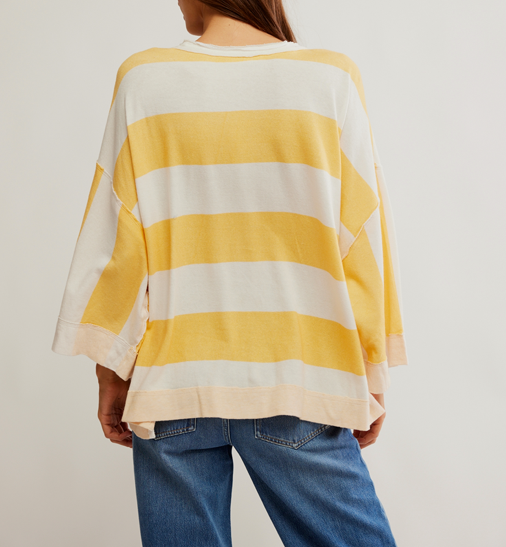 This Wonderful Tee in Yellow Combo offers a unique oversized fit that is perfect for all body types. The blue and white stripes add a touch of style to this classic Tee Shirt, making it a versatile and comfortable top for any occasion. Upgrade your wardrobe with this must-have piece today!
