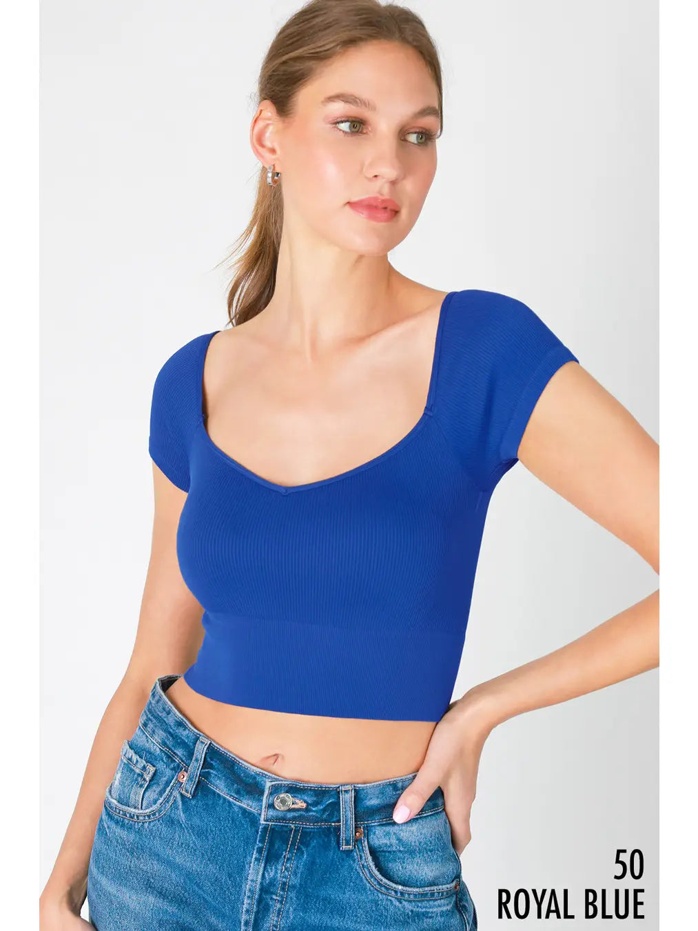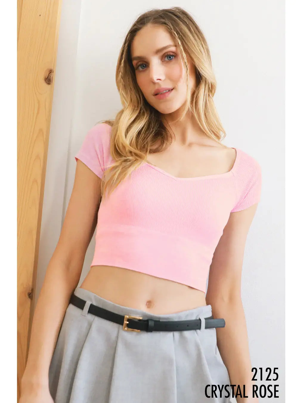This cap sleeve ribbed crop top is made for movement and style. Constructed with 92% Nylon and 8% Spandex, it offers a comfortable, lightweight fit. Its seamless square neck and cap sleeves make it the perfect top for athletic activities. Made in the USA.