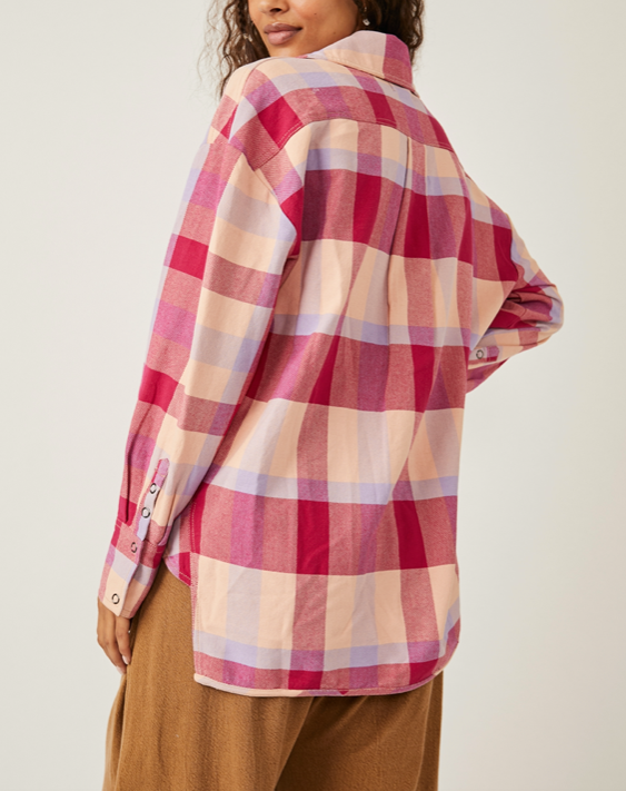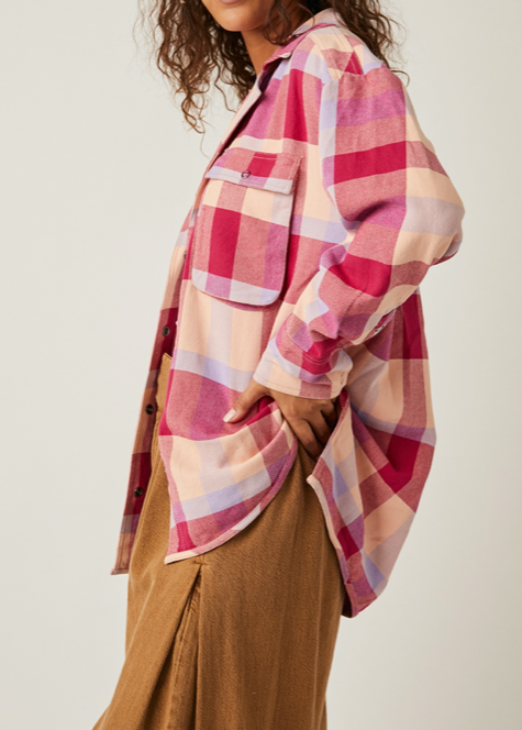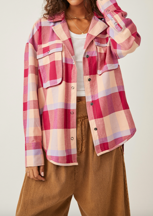 The Izzy Cargo Red and Tan jacket offers relaxed, oversized styling with dropped shoulders for an effortless look. Detailing includes a classic plaid pattern in warm, inviting colors for a timelessly stylish addition to your wardrobe.
