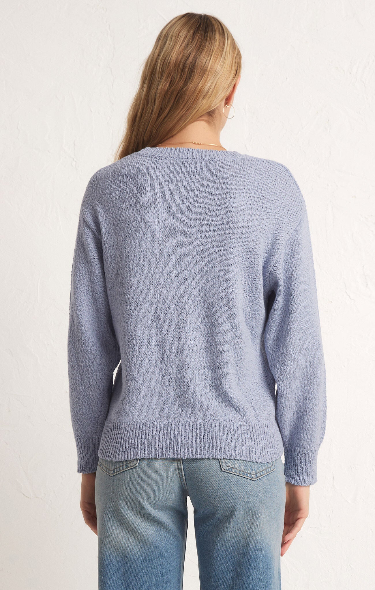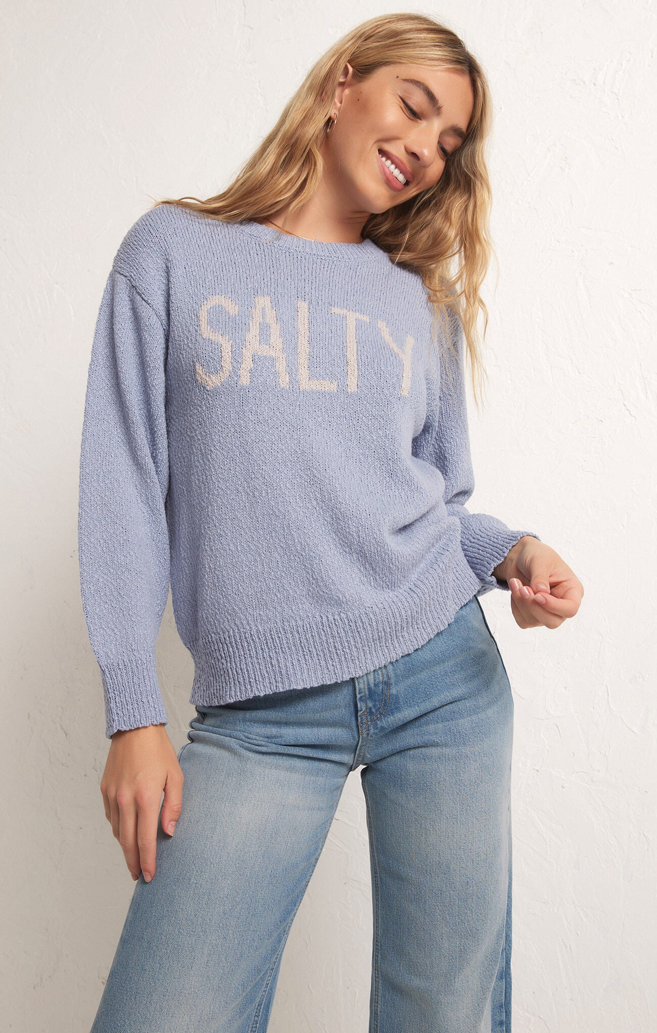 "The Waves and Salty Sweater is perfect for staying cozy and stylish. With a crew neckline and long sleeves, it features an intarsia "salty" design at the front chest. The mid-weight sweater is made from Oasis Slub Yarns, providing a relaxed fit and a length of 24" from the shoulder."