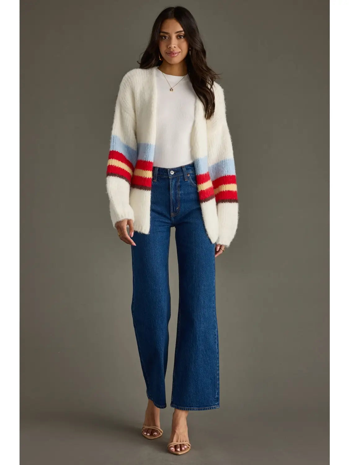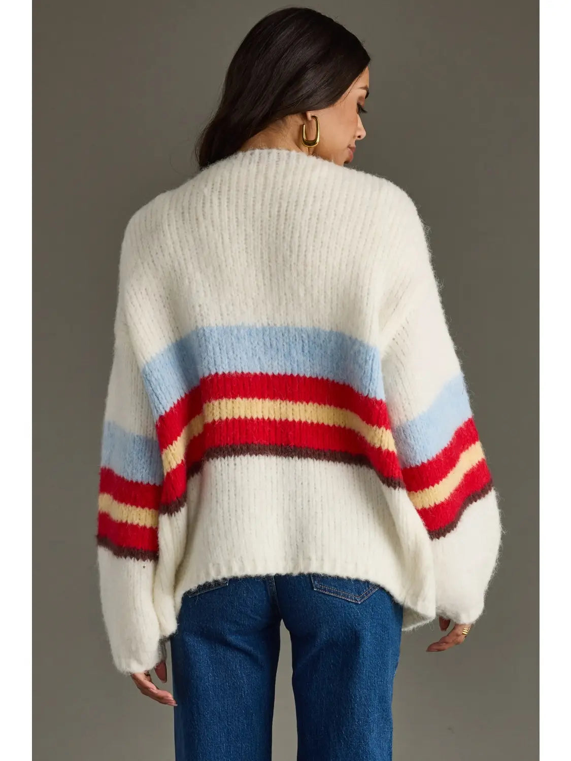 This ivory knit open cardigan features light blue, red, yellow, and black stripes and is made from 100% acrylic. Keep warm and stylish with this versatile and lightweight cardigan, perfect for any occasion.