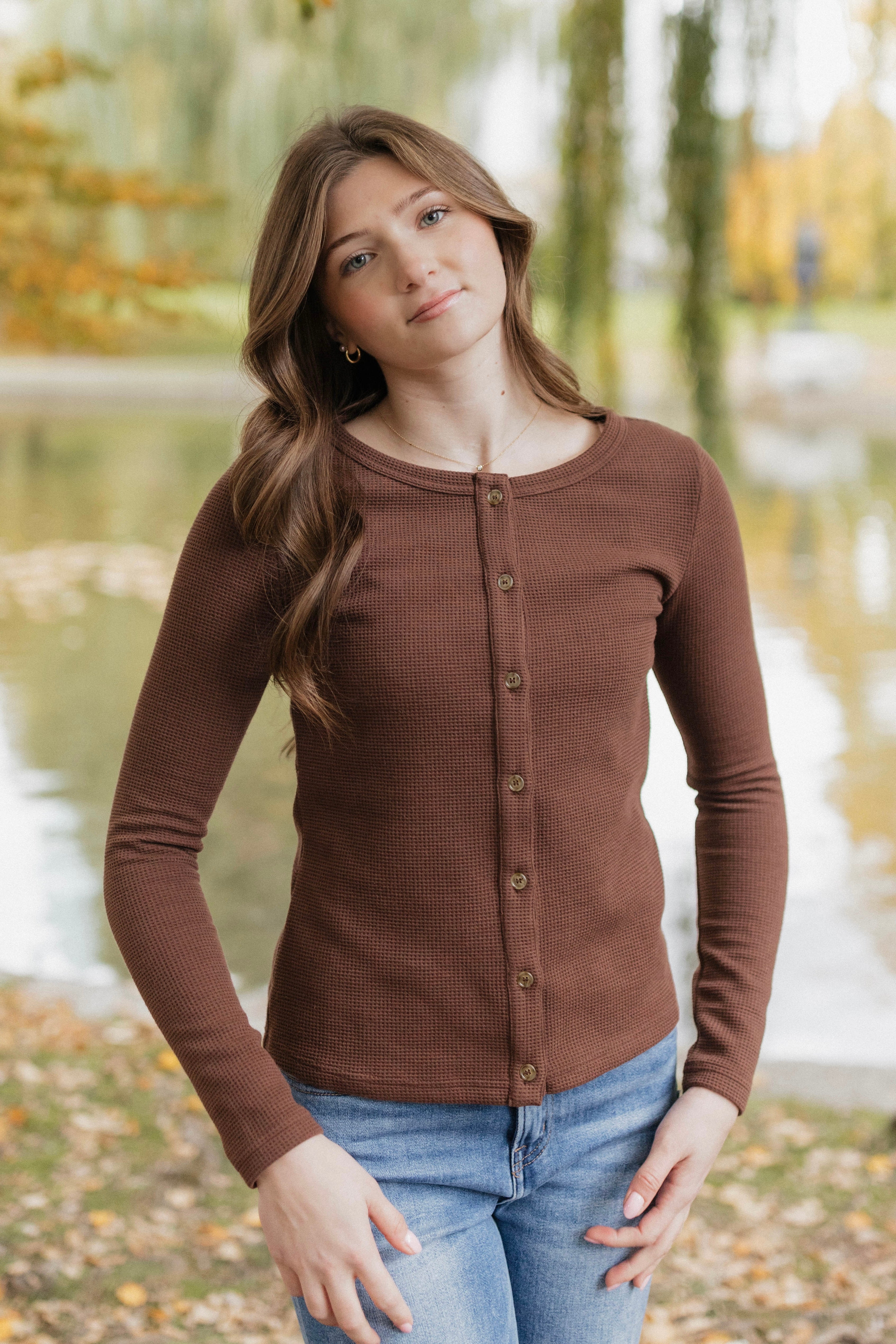 This season's must-have, the Waffle Button Henley in espresso brown, is the perfect addition to your fall and winter wardrobe. Made with a cozy waffle fabric, this button down offers both style and comfort. Stay on trend with this season's most popular color while staying warm and stylish. Model is wearing a size Small.