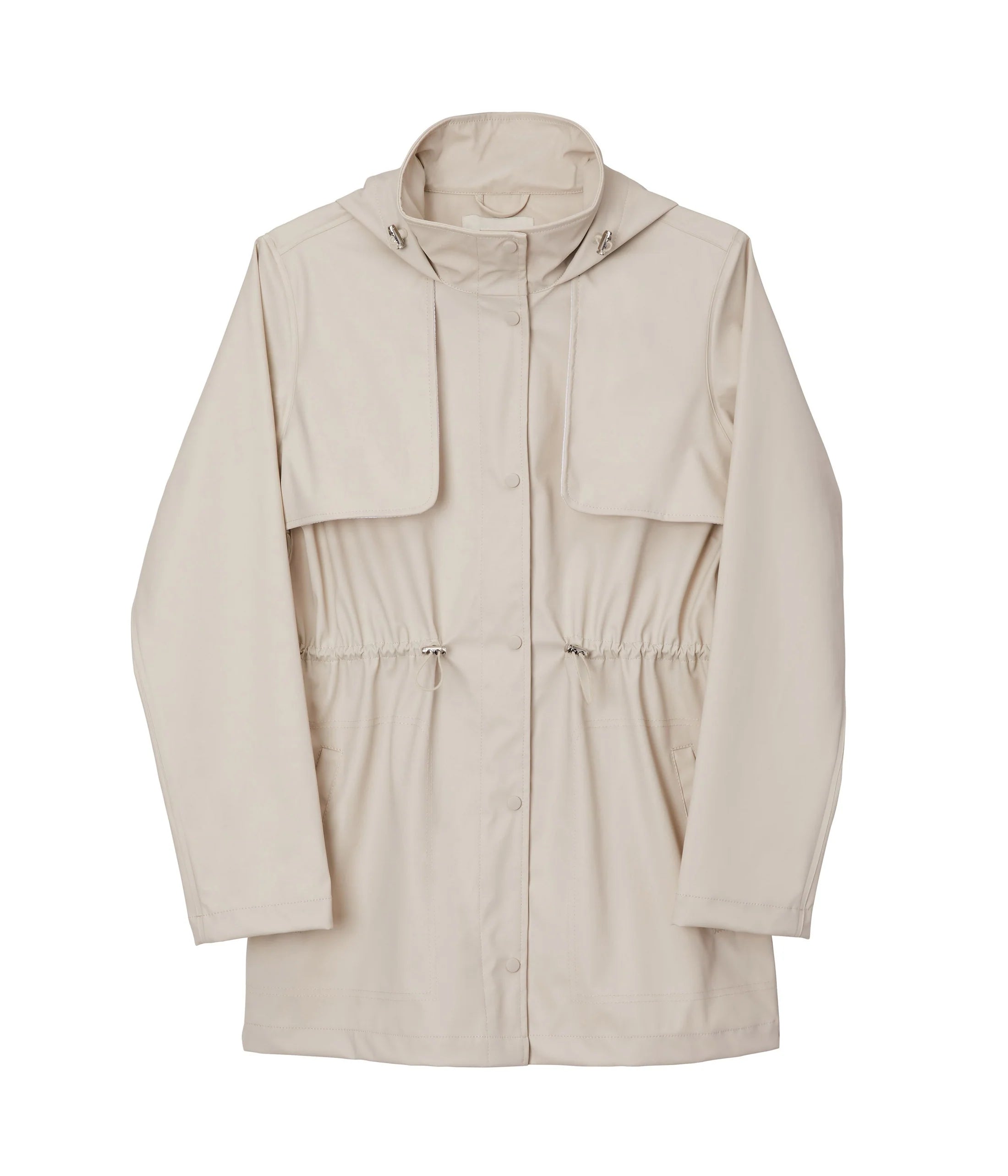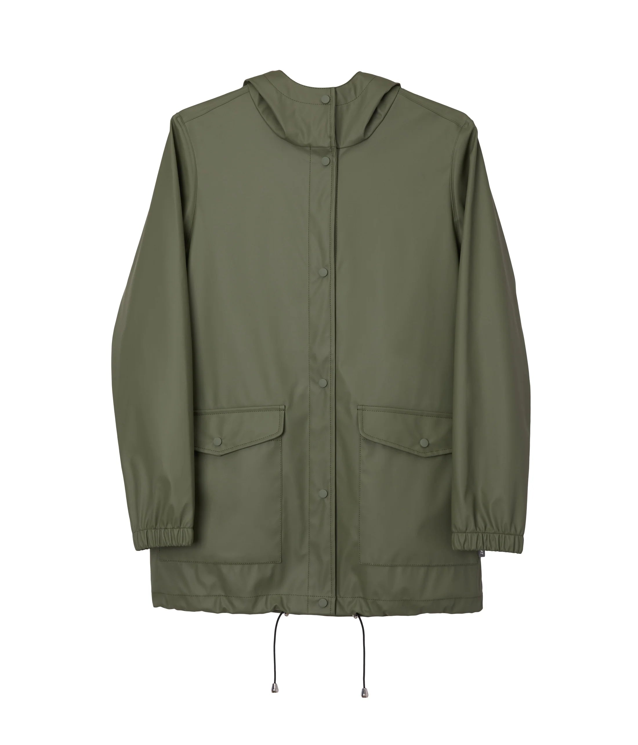 Stay warm and dry in the Alexis Jacket, made of 100% recycled polyester with PU coating for a waterproof rating of 3000mm. Featuring a snap front closure, drawstring waist detail, non-removable hood with drawstring detail, storm flap front, welt pockets, and ventilation holes at front and back armhole. Machine washable at 30°C, with a length of 30 1/2” approx.