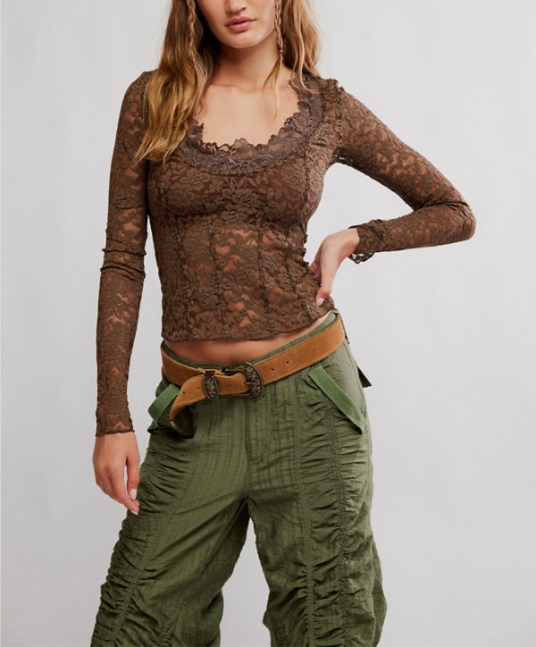 This All Night Long Sleeve in Teak features a stunning floral print and intricate lace design. Crafted with expert detail, this piece adds a touch of elegance to any outfit. Enjoy the benefits of effortless style and timeless beauty with this versatile top.