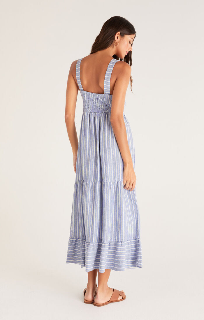 You're gonna love the fitted feel of the Ayla Striped Midi Dress, with its flattering neckline and bra-friendly straps with buttons at the back. The multi-directional stripe on our breezy Textured Rayon Linen Gauze fabric definitely makes a statement. This dress is unlined, and features a fun ruffle detail at the bottom hem. Fabric Content: 55% Linen 45% Rayon