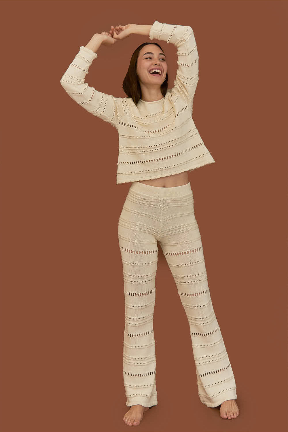 Balssia flared openwork knit pants are designed in Spain for a timeless look. Crafted from 100% cotton for a comfortable fit, featuring an elastic waistband and a high-waisted design. Pair it with the Mosa sweater to complete the look. Model wears a size S.