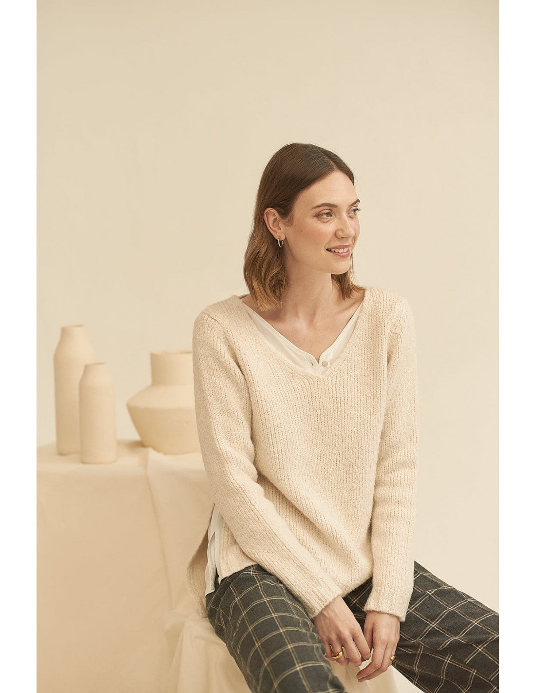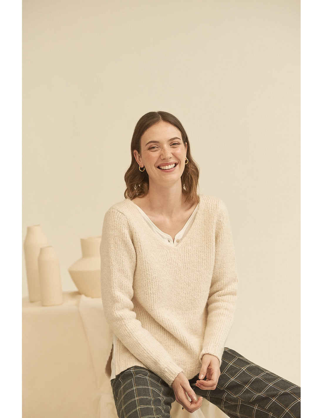 This is a natural colored chunky knit pullover. It features a V-neckline and slits on the sides for comfort, it is slightly longer in the back.