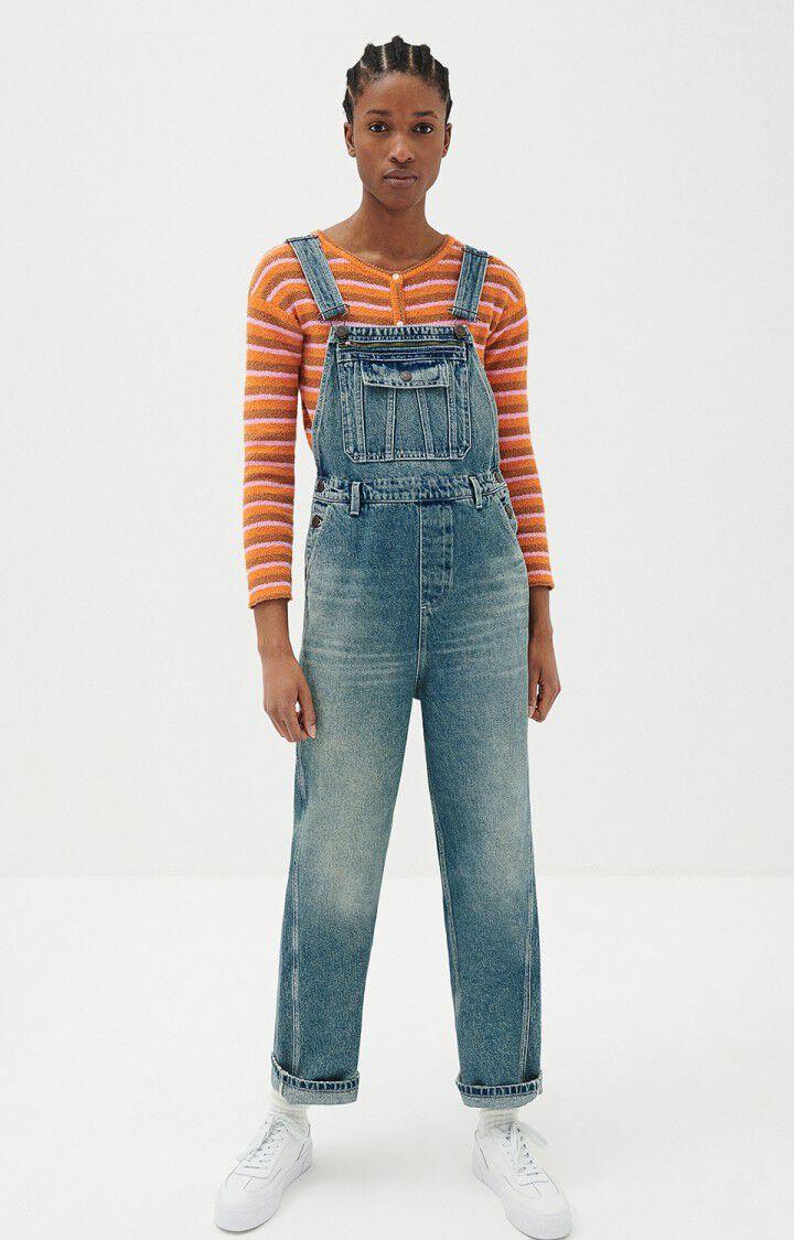 Washed blue overalls with green detailing in the zipper.