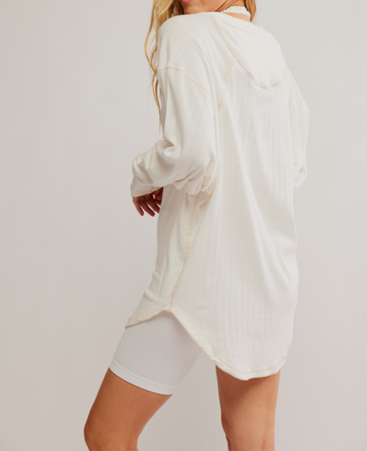 Upgrade your lounge game with our Coffee Chat Pullover. Made with a soft, pointelle knit, this long-sleeve pullover will keep you cozy while the deep V-neckline with button detail adds a touch of elegance. Perfect for a casual catch-up or a cozy day in.