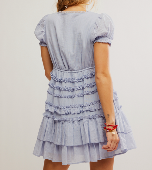 The Darcy Mini dress features a fluttery babydoll silhouette with a V-neckline, tiered ruffle trimming, puffed sleeves, and a drawstring detail at the bust. Versatile and stylish, it can be dressed up with tall boots or dressed down with beachy sandals. The perfect addition to any wardrobe.