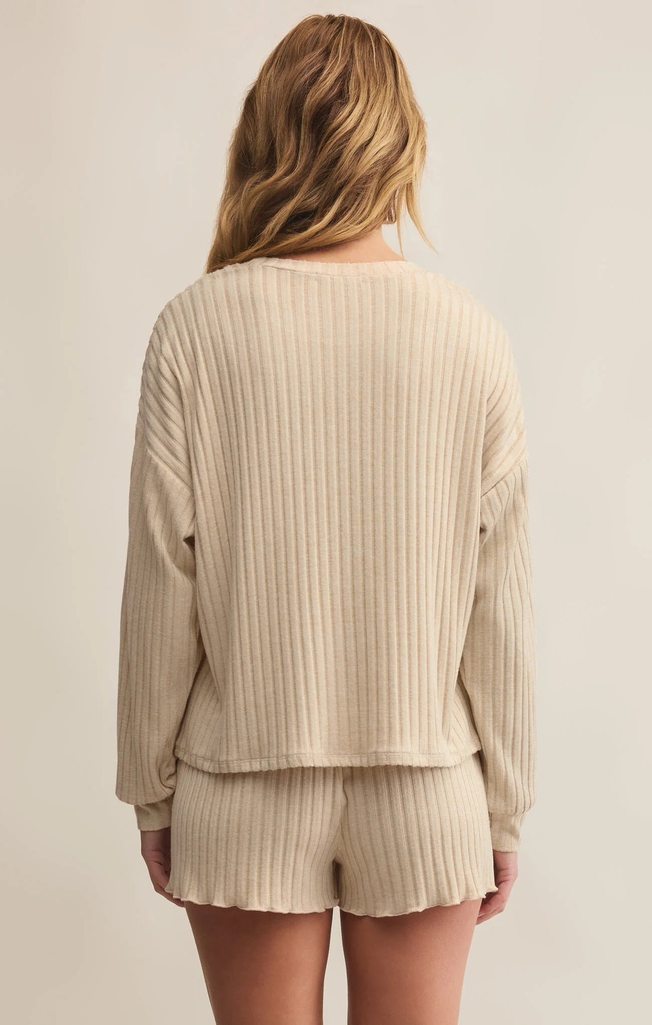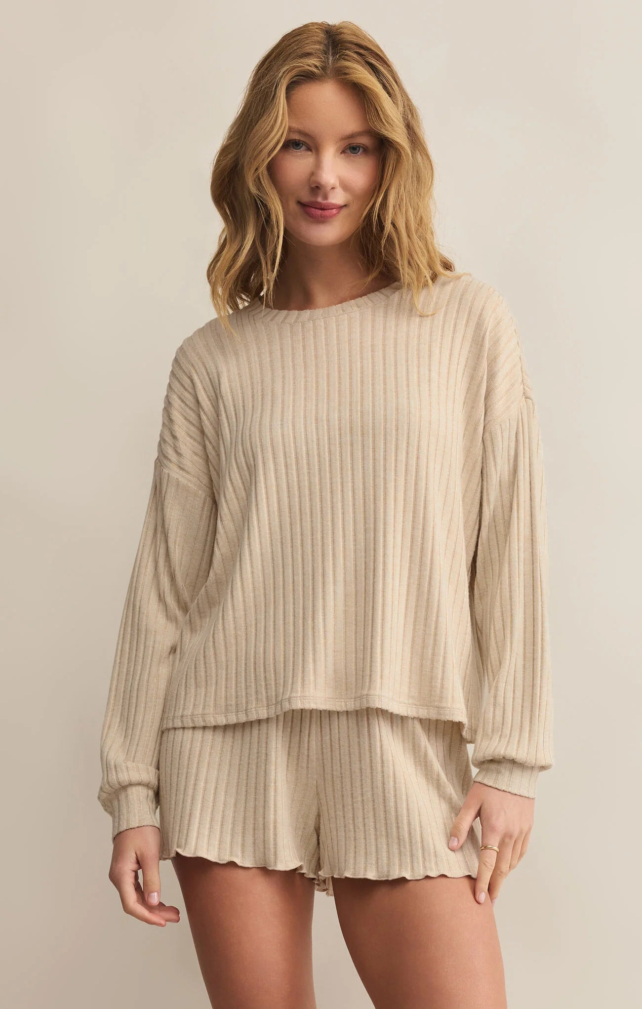 Experience luxury comfort with our Daydream Ribbed Long Sleeve Top in Bone. Silky soft with a barely-there feel, this top is perfect for lounging or layering. The relaxed fit and luxe rib knit provide both comfort and style. Made with silky rib fabric, featuring a crew neck and long sleeves. Machine washable for easy care.