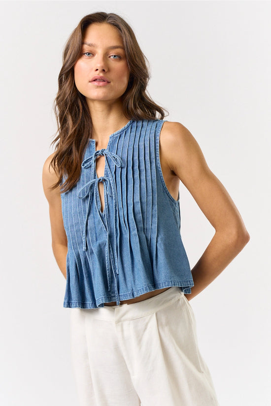 Add a touch of chic to your spring and summer wardrobe with our Denim Front Tie Pleated Top. The front tie adds a flattering touch, while the pleated detailing creates texture and movement. Its cropped design is perfect for pairing with high-waisted bottoms for a stylish yet laid-back look.
