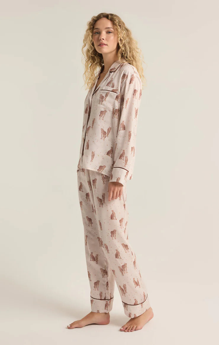 The Dreamer Cheetah Set in Sea Salt offers a comfortable fit with its v-neck design, mid rise waist, and elastic waistband. Stay cozy with the long sleeves and side seam pockets. Perfect for everyday wear.