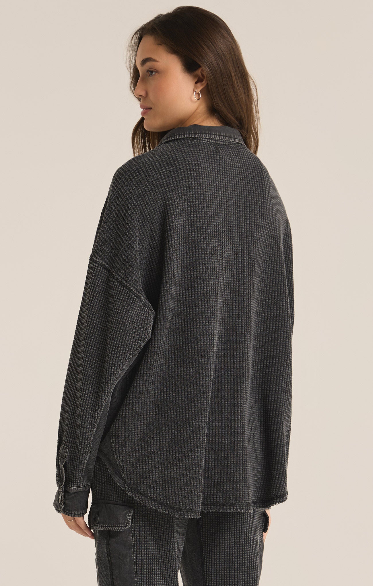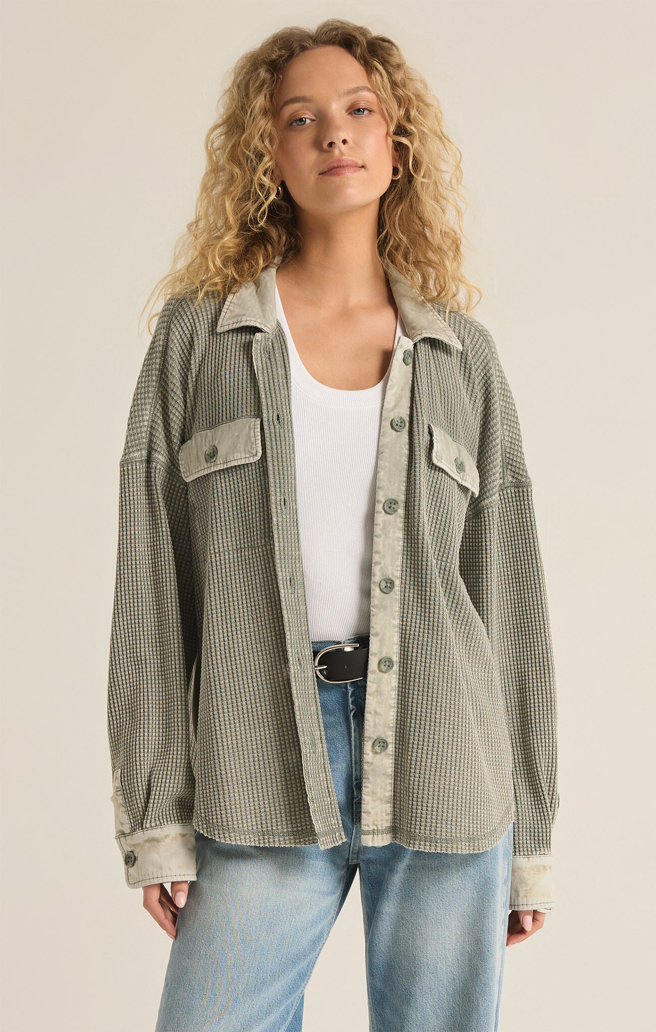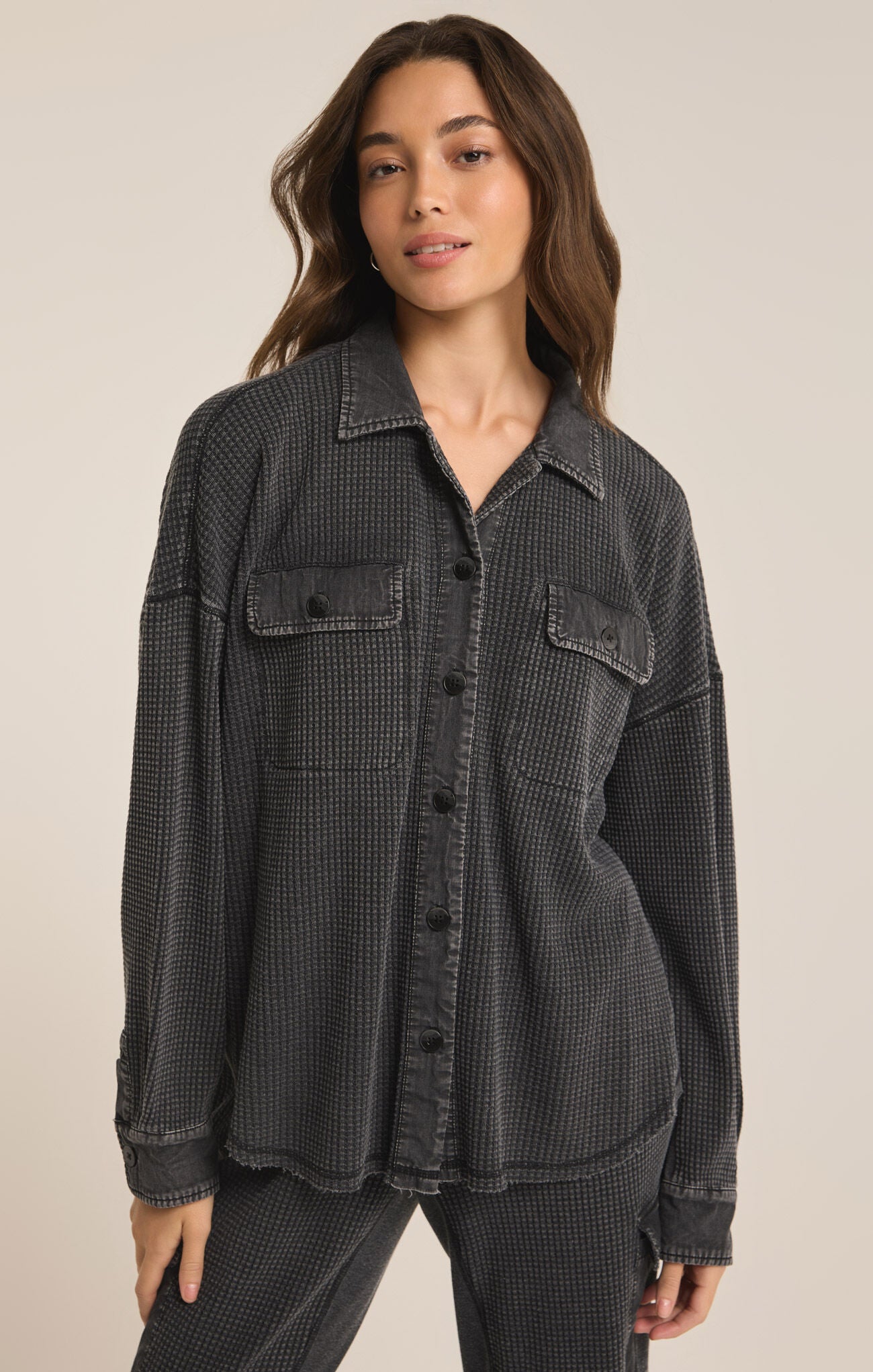 The Elijah Waffle Jacket features a button front and chest pockets with flaps for a classic and functional look. The seaming details at the side seams add a touch of style, while the curved hem shape creates a flattering silhouette. Made with a large waffle thermal fabric, this jacket offers both warmth and comfort. Regular fit with a length of 27" from the shoulder.