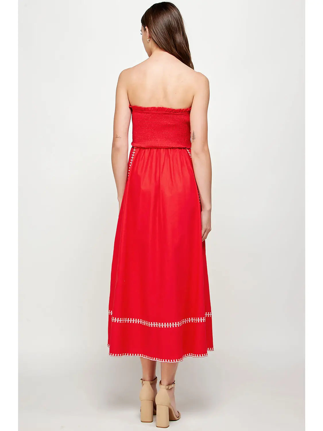 Embroidered smocked tube midi dress in linen fabric. This style features smocked tube bodice with ruffles, midi length, embroidery detail throughout skirt.