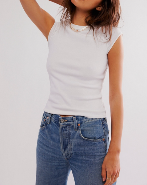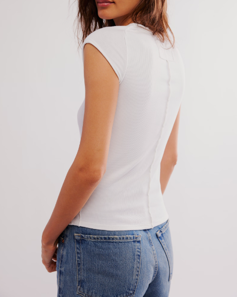This elegant ivory tee offers a soft, ribbed texture with a stretchy feel for ultimate comfort. Featuring a classic crew neckline and cap-inspired sleeves, its minimal design is elevated by the raised seam detail. A must-have addition to any wardrobe.
