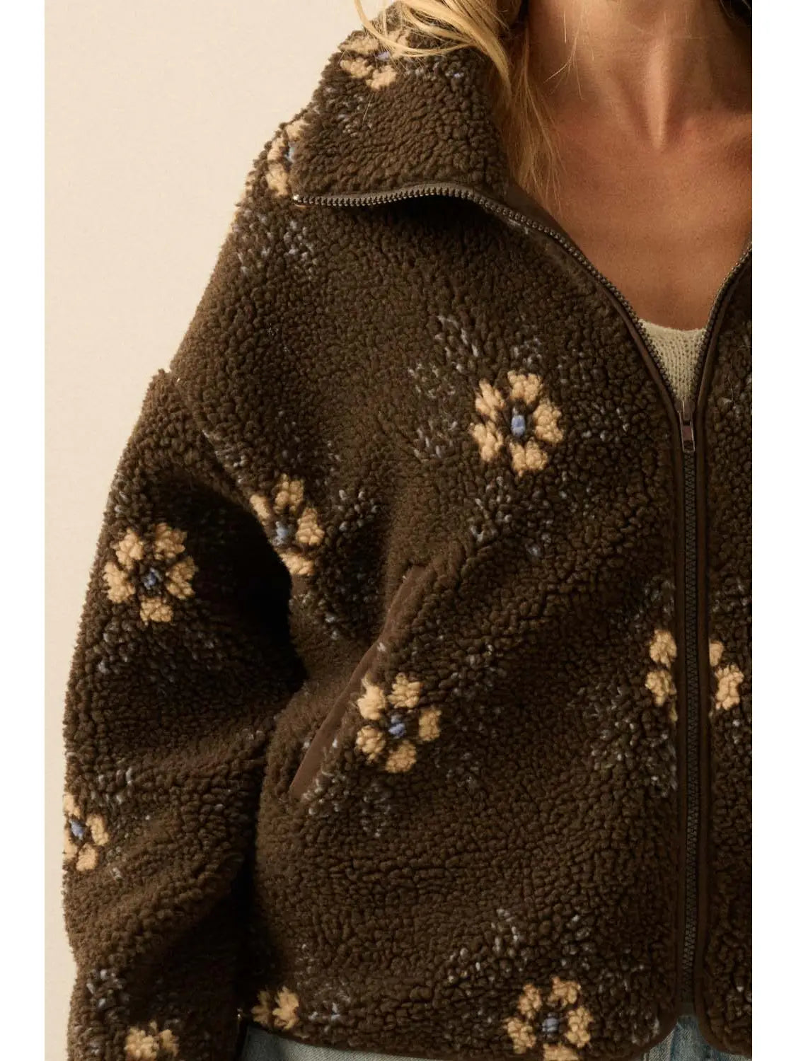 As a floral-print sherpa fleece jacket, this jacket is sure to keep you warm and stylish with its high collar and full lining. The zip-up front closure and side pockets provide practicality while the relaxed fit and drop shoulder add a touch of comfort. Perfect for any chilly day.