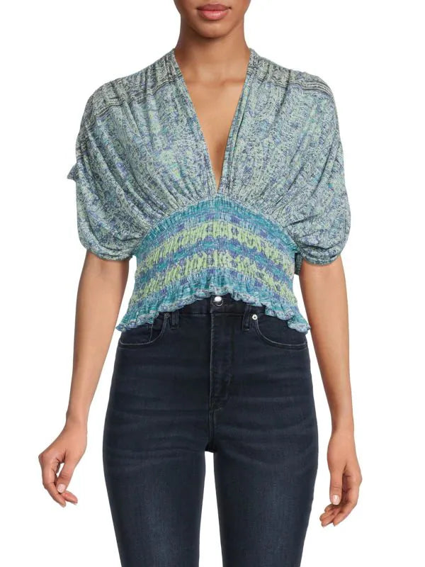 Embrace the vacation lifestylein this crop top. It has an intricate print allover, a smocked waistband that restructures the loose, ruched sleeves and a back tie. It can be paired with flowy skirts and harem pants for a fun, bohemian look.